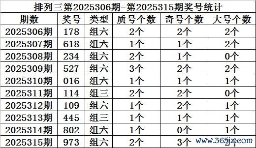 上期转头:陈设三第2025315期开奖:973,质合比为2:1,奇偶比为2:1,大小比为3:0。